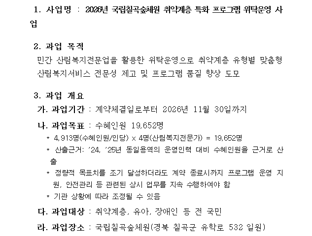 「2026년 국립칠곡숲체원 취약계층 특화프로그램 위탁 운영사업」입찰공고